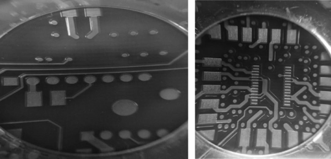 (2)最后一次阻焊制作。使用靜電噴涂或噴涂工藝生產(chǎn)(避免噴涂時阻焊入孔),阻焊曝光時使用正常的阻焊曝光底片資料生產(chǎn),阻焊完成后的效果見圖1。