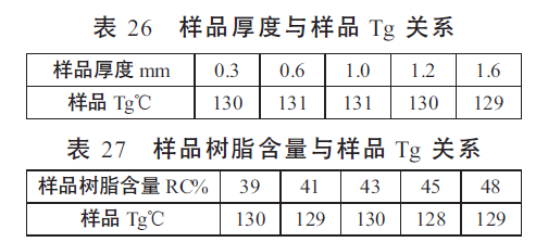 我們還考察了基板厚度, 基板樹脂含量,樣品存放時(shí)間對基板Tg 的影響情況。表26,表27 說明,不同基板厚度,不同樹脂含量,對基板的Tg 沒有什么影響(見)。但樣品存放時(shí)間對基板的Tg 有一定影響。隨著基板儲(chǔ)存時(shí)間延長,基板的Tg 將逐步降低。這與基板在存放過程吸濕有關(guān)。因此,覆銅板一定要做防潮包裝,特別對于高Tg 產(chǎn)品。