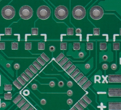 在下面的示例中,綠色焊接掩模應(yīng)用于PCB板的大部分,覆蓋小的跡線,但留下銀環(huán)和SMD焊盤暴露,以便它們可以焊接到。