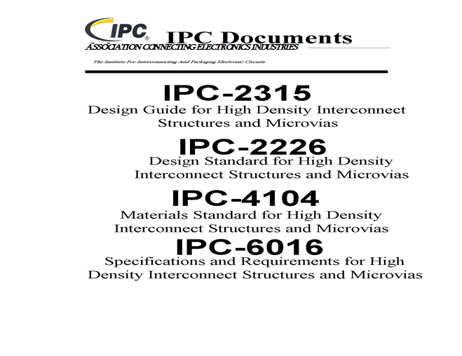 IPC-2226:該規(guī)范教育用戶微孔形成,布線密度選擇,設(shè)計規(guī)則選擇,互連結(jié)構(gòu)和材料表征。旨在提供用于利用微孔技術(shù)設(shè)計印刷電路板的標準。