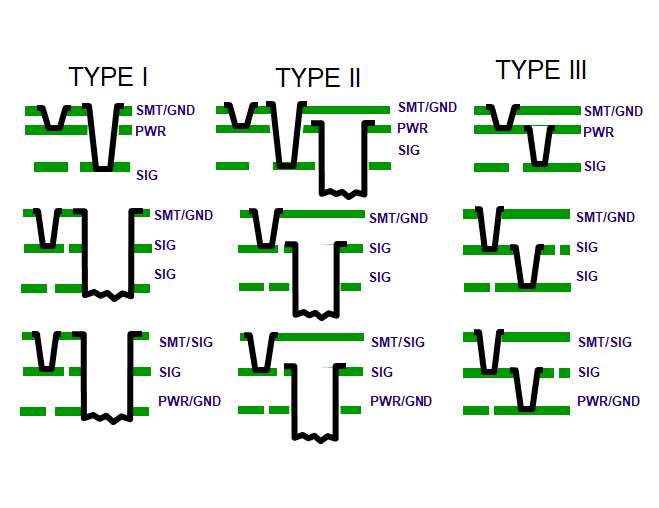 圖7.顯示了一些最常見的HDI疊層,以減少TH過孔的數(shù)量。三種常見的HDI疊層顯示為IPC-Type結(jié)構(gòu)(I,II和III)。