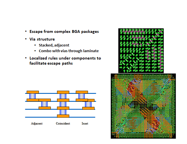 用于BGA扇出的微孔如圖9所示。微孔可放置在BGA焊盤外(插圖),部分放入/放出焊盤(部分vip)或完全放入'焊盤'(vip) - 見圖10 ..如果放置焊盤中的通孔,則通孔應(yīng)始終為“偏心”,而不是放置在焊盤的直接中心。這是為了最大限度地減少焊接過程中任何被困空氣的“空洞”。如果將通孔放置在BGA焊盤的中心,并且沒有填充,則當焊膏施加在焊盤上,并且BGA放置在焊盤上時,在回流期間,當焊料熔化時,BGA球落下并捕獲可能存在的任何空氣,就像“瓶中的軟木塞”。通過將通孔“偏離中心”,當焊料熔化并流入微孔時,空氣有機會逸出。